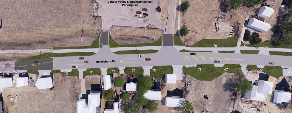 Below are a few rendered images of what the reconstructed Northshore Drive will look like once complete. Note that there driveways and approaches are shown for reference, and each property will have a new concrete approach that is field fit to match existing garage or driveway dimensions.
